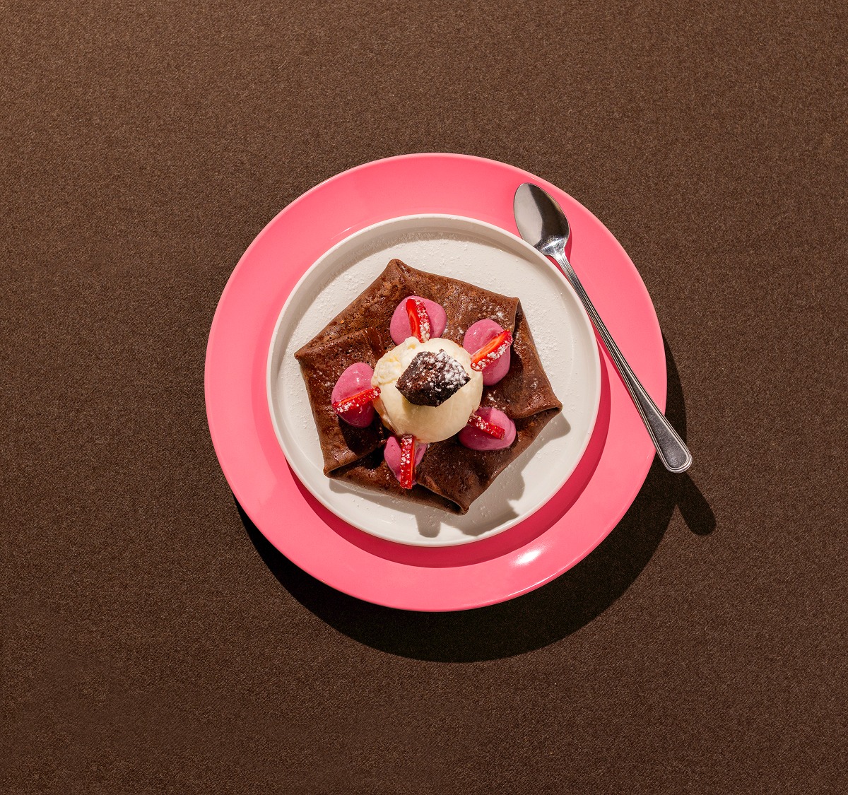Brownie y galleta chocochip Lulis; muesli, salsa de frutos rojos y gelato Saúl de vainilla.